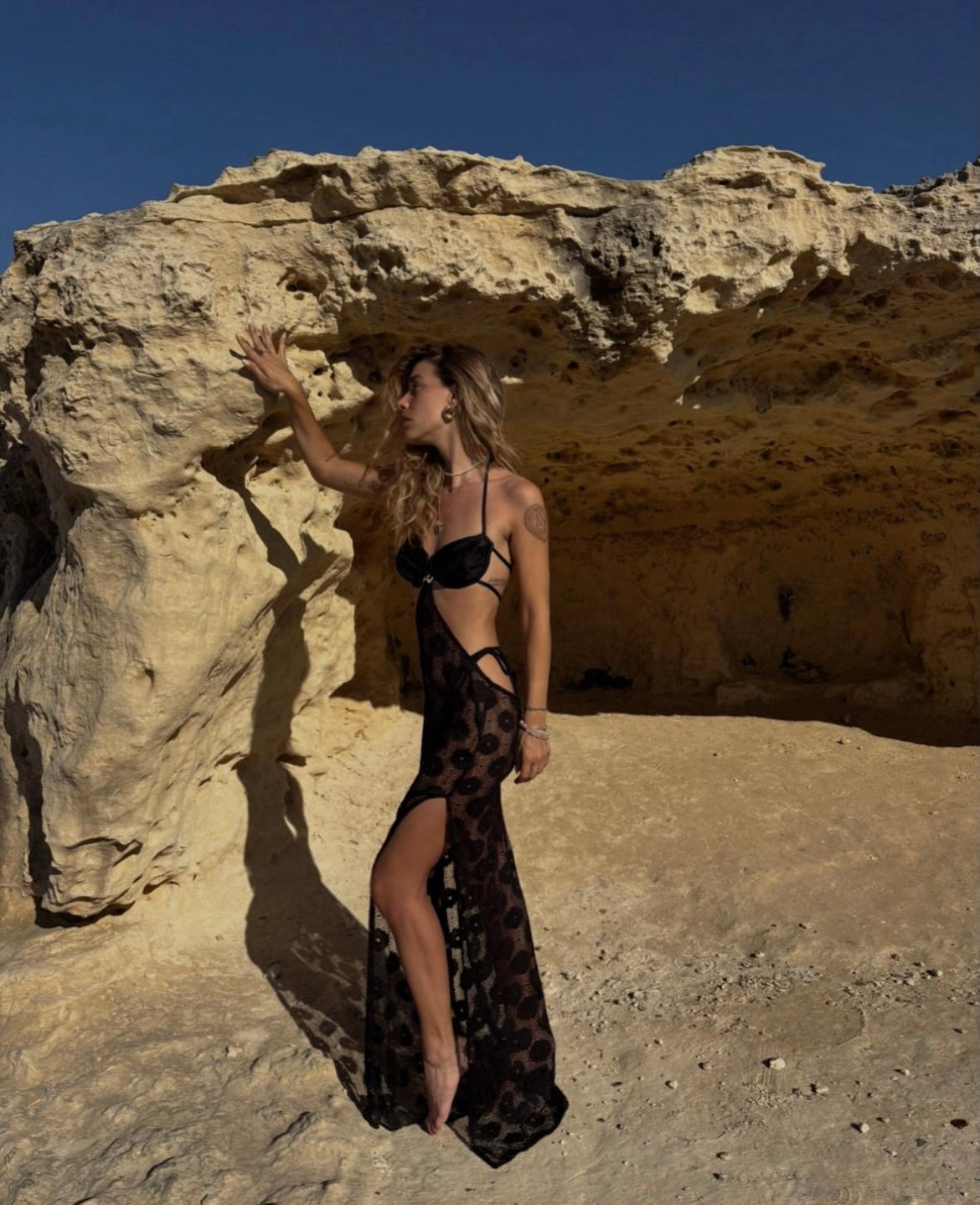 Abito con gonna in in leggerissimo pizzo agganciata al bikini lo trasforma istantaneamente in un abito elegante.